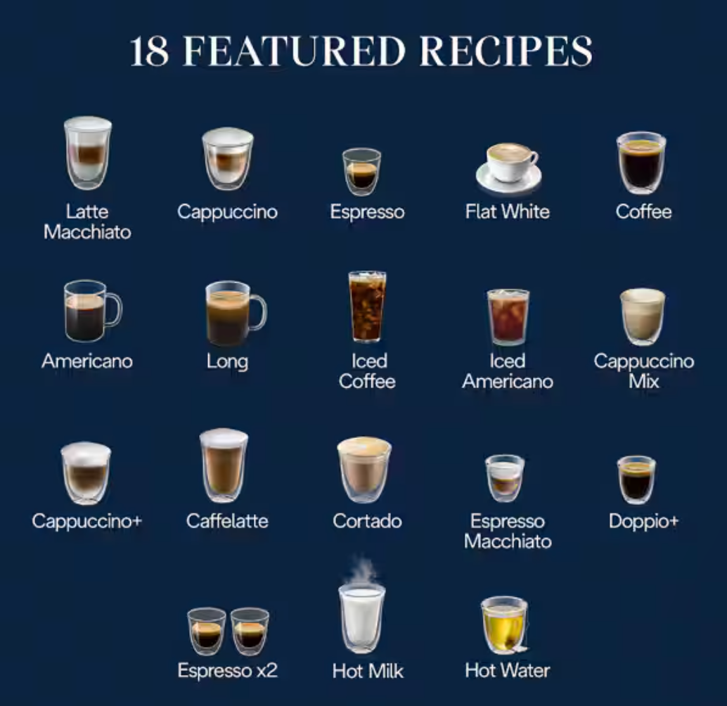 Avec 4 tailles de boissons et 5 options d'intensité, ajustez facilement les boissons selon vos préférences avec 18 recettes prédéfinies : Latte, Latte Macchiato, Cappuccino, Espresso, Flat White, Café, Americano, Long, Café glacé, Americano glacé, Cappuccino Mix, Cappuccino+, Cortado, Espresso Macchiato, Doppio+, 2x Espresso, Lait chaud et Eau chaude.