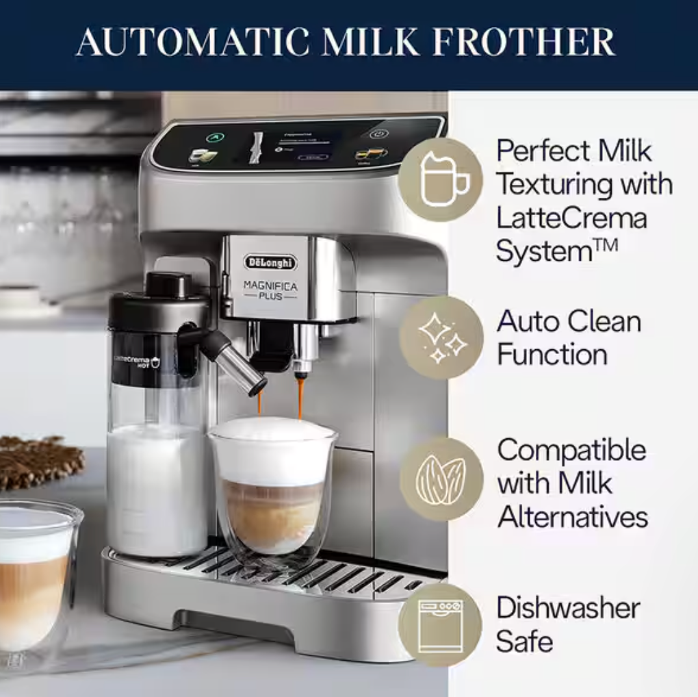 Bénéficiez d'une préparation sans effort et d'une variété infinie de boissons avec la Magnifica Plus entièrement automatique. Choisissez parmi 18 recettes à la touche, dont des lattes, des cappuccinos et des cafés glacés. Profitez de résultats dignes d'un barista grâce au moulin et à la cafetière intégrés, et personnalisez vos boissons grâce à la technologie de moussage de lait LatteCrema™ de De'Longhi. L'écran tactile intuitif et les profils utilisateur simplifient la personnalisation, tandis que le système de nettoyage facile garantit un entretien sans tracas.