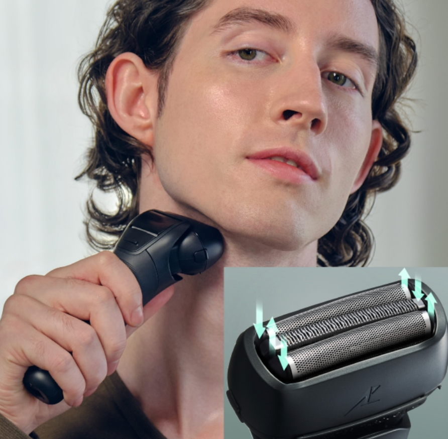 La tête du rasoir est conçue pour être flexible, permettant un mouvement dans 2 directions : gauche et droite. Les 3 lames flottantes individuelles fonctionnent ensemble pour raser efficacement la barbe sans avoir besoin d'une pression supplémentaire, ce qui permet un rasage efficace.