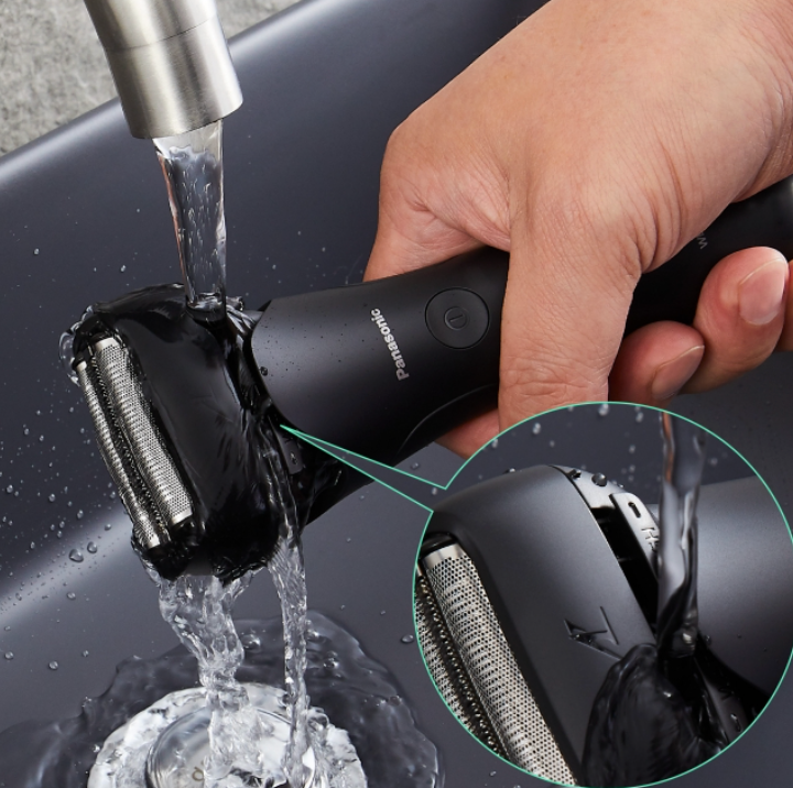 Le rasoir électrique est étanche, permettant un entretien facile et hygiénique en le rinçant sous l'eau courante. Pour un nettoyage rapide, ouvrez simplement l'arrivée d'eau sur le devant de la tête du rasoir et rincez à l'eau courante.