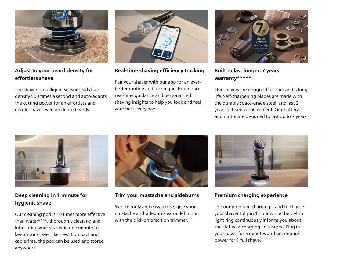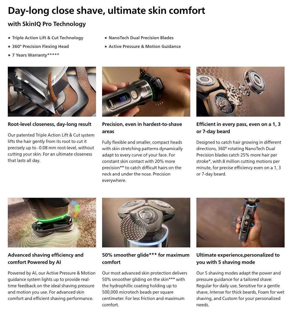 Philips i9000 Prestige Ultra, our most innovative shaver with Triple Action Lift & Cut system that cuts hair at root-level for day-long closeness, even in hard-to-shave-areas. SkinIQ Pro now brings 5 shaving modes for ultimate skin comfort.