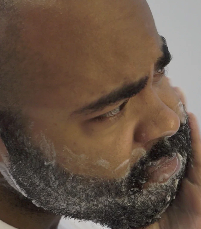 Mouiller la barbe avec de l'eau tiède et masser soigneusement avec une cuillerée de produit de lavage.